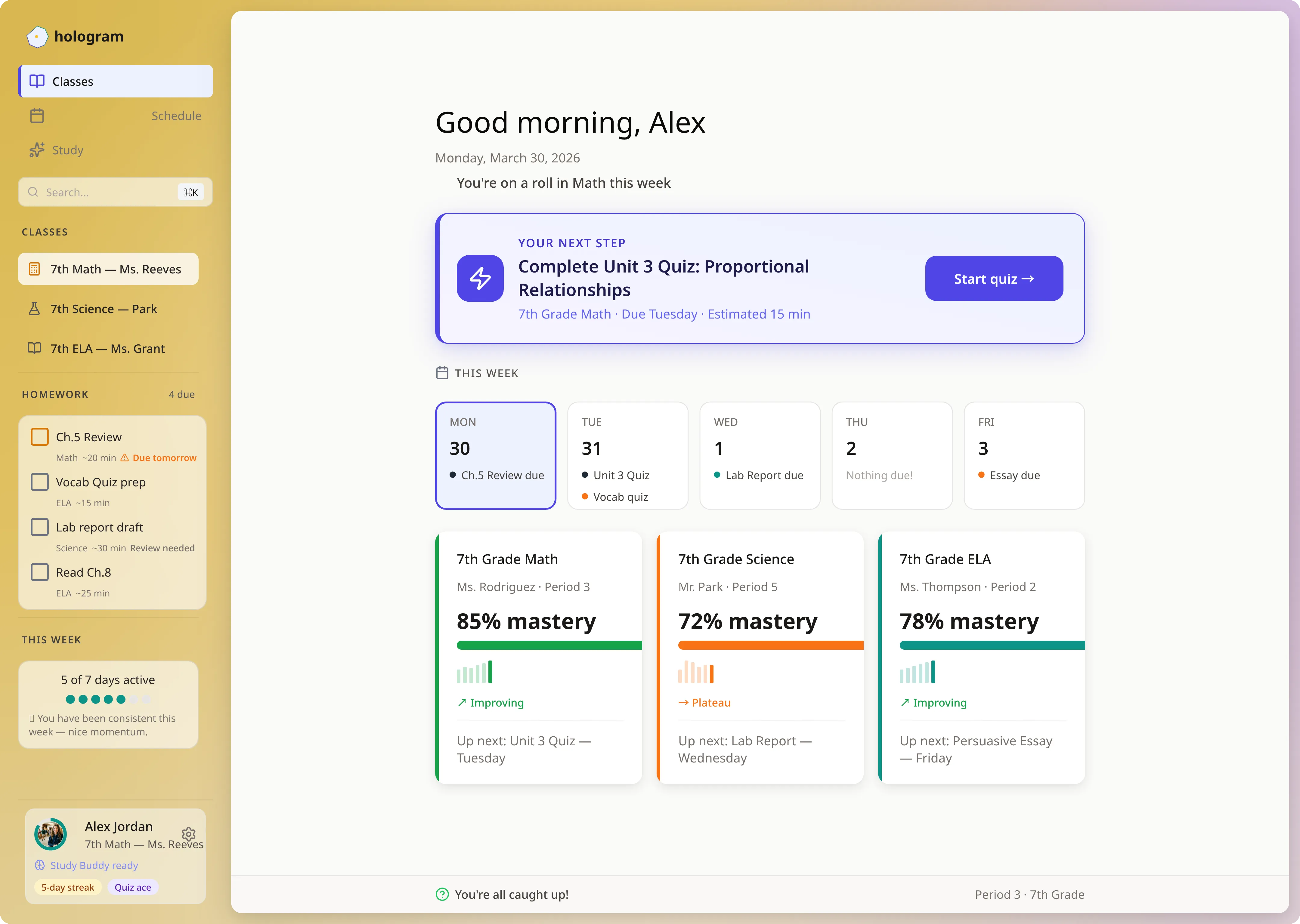Hologram is built from scratch on a different foundation — a mastery data model where every student interaction maps to specific learning standards, prerequisite relationships, and cognitive science. The AI isn’t a feature bolted onto a gradebook. It’s the native intelligence layer of a system designed for learning, not administration.